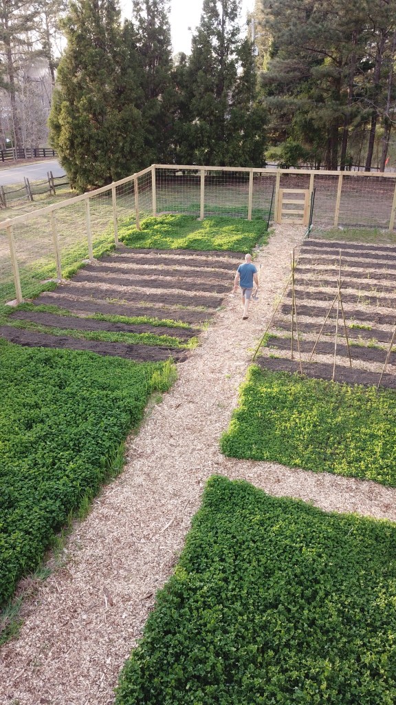 The market garden arial view in early spring. Note the compost system is up on the top right of the picture